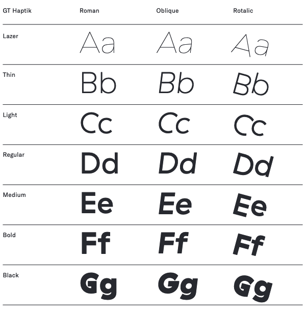 GT Haptik is the result of research by Reto Moser and Tobias Rechsteiner from 2009 to 2014. The project explored whether a Latin typeface could be read through touch while blindfolded. The resulting typeface can function as an alternative tactile reading system, with uppercase forms designed for both tactile and visual legibility. Lowercase forms were added later to support longer text use while maintaining an optically balanced texture.