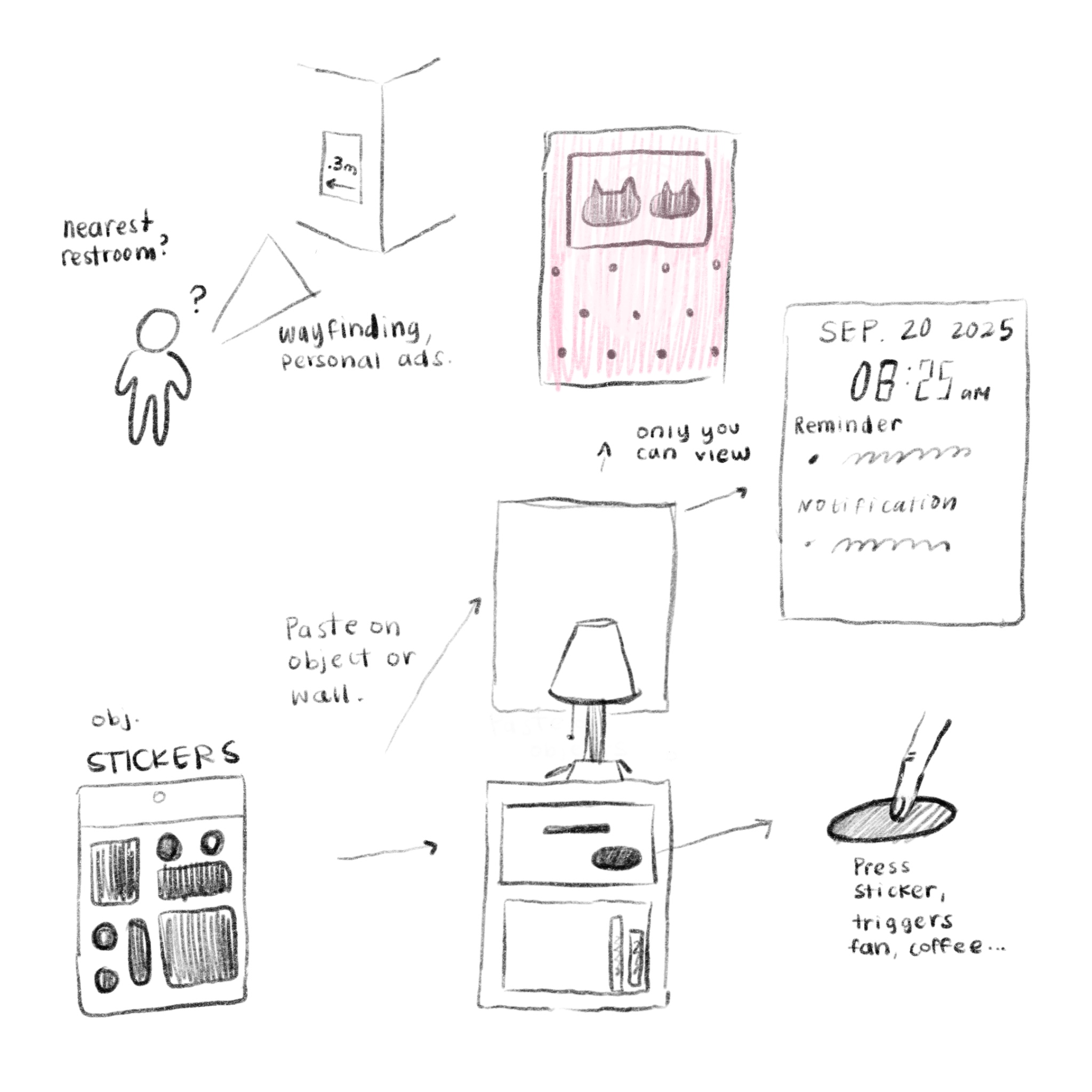 World building here is still partial: the cone and gestures describe a near-future domestic space where cheap stickers and ambient displays co-exist. The live build below is hosted on GitHub Pages—step through palm hold, recycle bin, and add-message flows the same way reviewers would use a gesture demo.